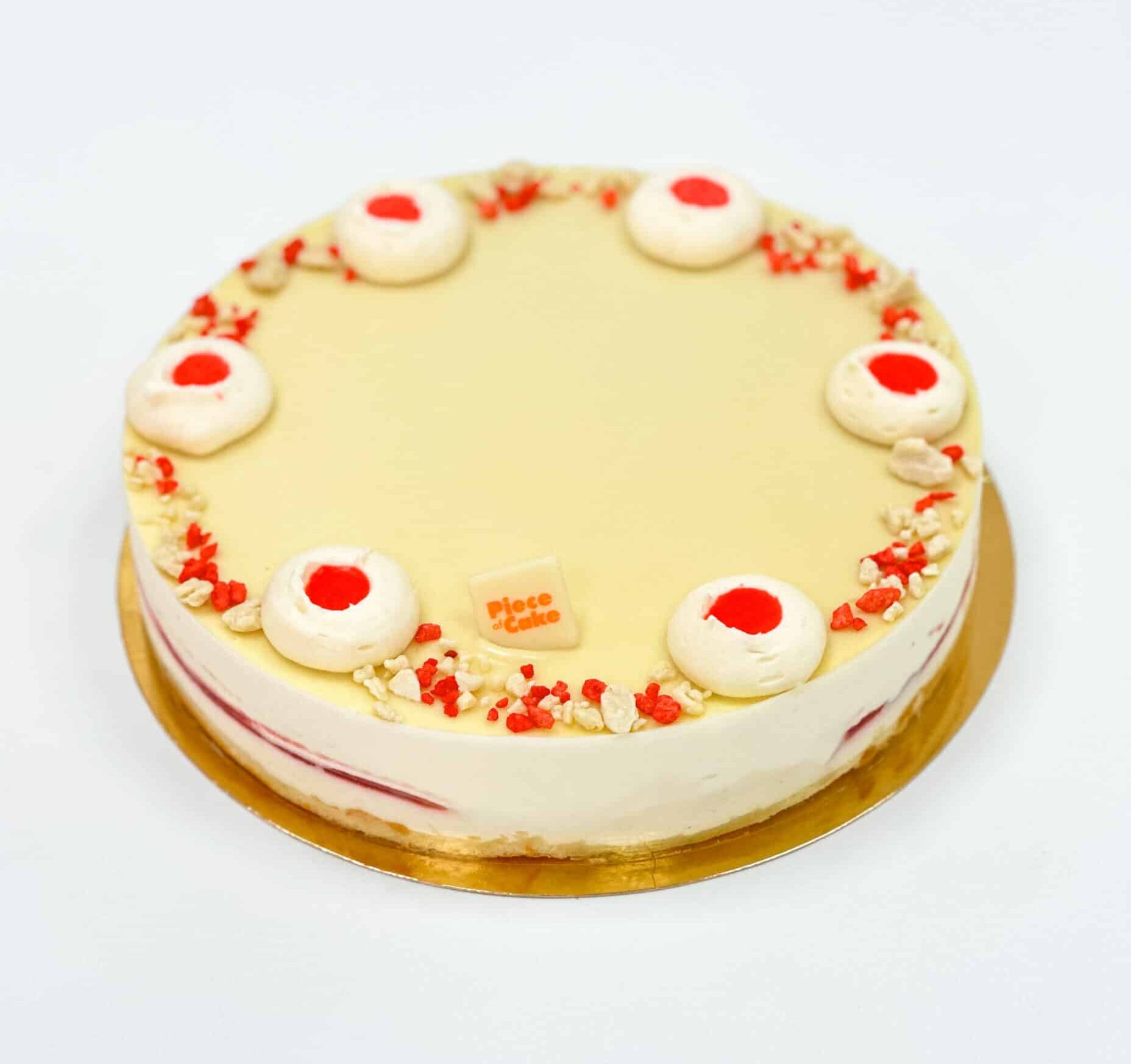 שכבות רולדת וניל, קרם וניל ושמנת עם מרמלדת תותים וקרם פנקוטה וניל, בציפוי גנאש שוקולד לבן